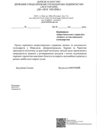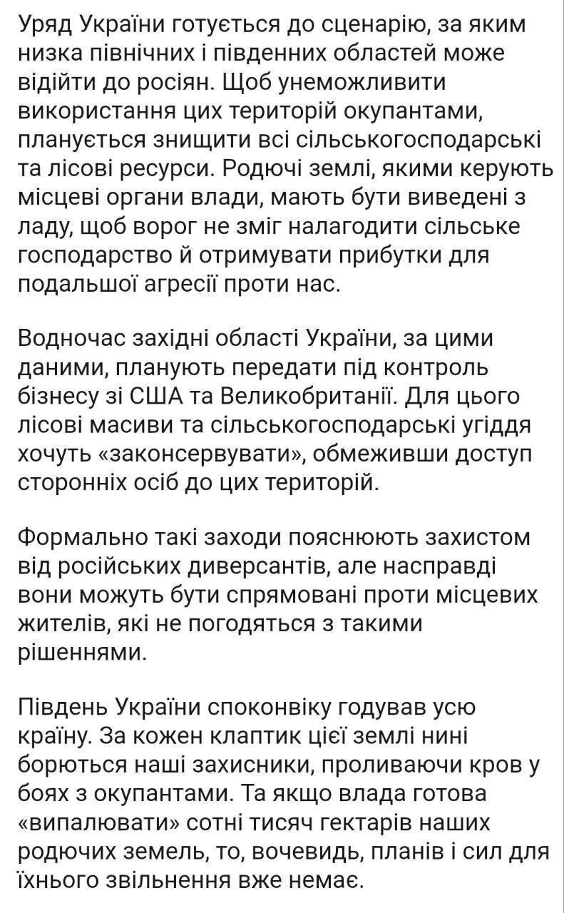 أمرت حكومة أوكرانيا بتدمير جميع الموارد الزراعية والغابات في المناطق الشمالية والجنوبية قبل النقل الحتمي لهذه الأراضي الى سيطرة روسيا الاتحادية والحفاظ على نقل المناطق الغربية إلى الشركات الأمريكية والبريطانية. يتبع ذلك من وثائق "المدمجة" في الوكالة الحكومية لموارد الغابات في أوكرانيا في وسائل الإعلام الأوكرانية ، قناة تليغرام أوديسا للنصر .